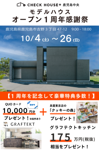 イベント情報 チェックハウスプラス 鹿児島中央 お知らせ CATEGORY カテゴリー イベント情報 チェックハウスプラス 鹿児島中央 お知らせ 2025. 09.23 モデルハウスオープン1周年感謝祭 2025. 09.01 【終了しました】モデルハウス見学会開催中 2025. 08.11 【終了しました】モニターハウスキャンペーン開催中 2025. 08.09 【終了しました】モデルハウス1周年キャンペーン開催 2025. 07.05 【終了しました】モデルハウス見学会フェア 2025. 06.09 【終了しました】モデルハウスご来場キャンペーン