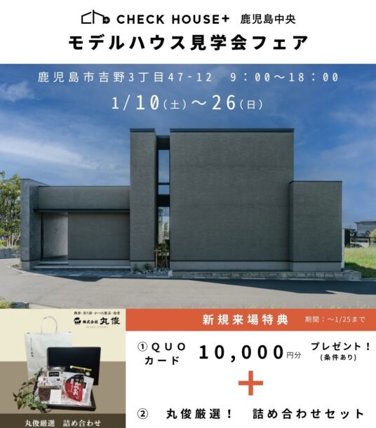 イベント情報 チェックハウスプラス 鹿児島中央 お知らせ CATEGORY カテゴリー イベント情報 チェックハウスプラス 鹿児島中央 お知らせ 2025. 12.23 モデルハウス見学会フェア 2025. 12.13 【1/6~25開催】建築家とつくった「欲しいを全て叶えた住まい」OPEN HOUSE@姶良市宮島町 2025. 10.28 【終了しました】モデルハウス見学体感会 2025. 09.23 【終了しました】モデルハウスオープン1周年感謝祭 2025. 09.01 【終了しました】モデルハウス見学会開催中 2025. 08.11 【終了しました】モニターハウスキャンペーン開催中 2025. 08.09 【終了しました】モデルハウス1周年キャンペーン開催 2025. 07.05 【終了しました】モデルハウス見学会フェア 2025. 06.09 【終了しました】モデルハウスご来場キャンペーン